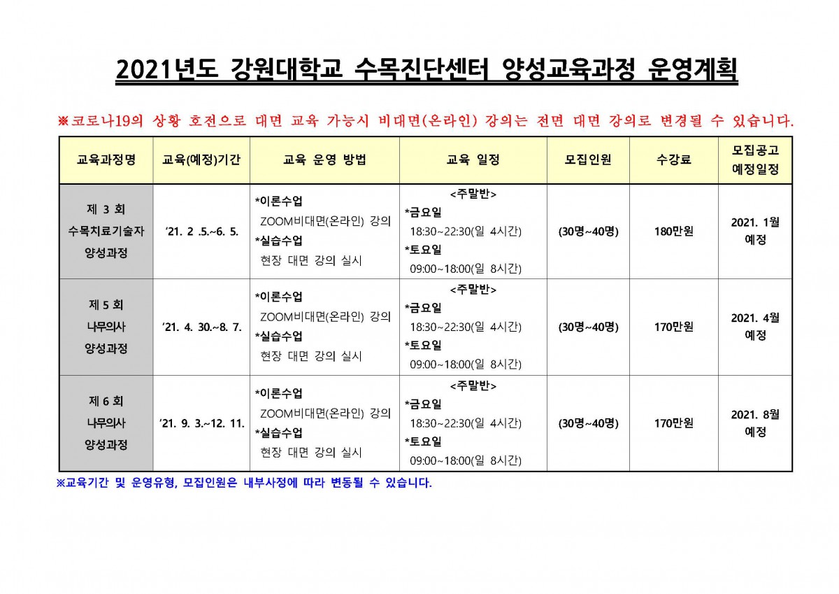 - 2021년도_강원대학교 수목진단센터_나무의사 수목치료기술자 양성교육_운영계획.pdf (72.1K) 402회 다운로드 | DATE : 2021-01-06 16:21:04