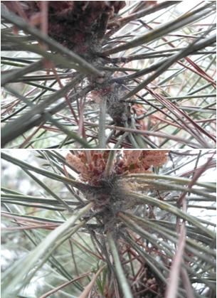 건물내 조경되어 있는 소나무 2그루의 잎이 전체적으로 희색가루가 내려앉은 것 처럼 색이 변하고 거미줄 같은 것이 많이 있습니다. 약을 | ||||||