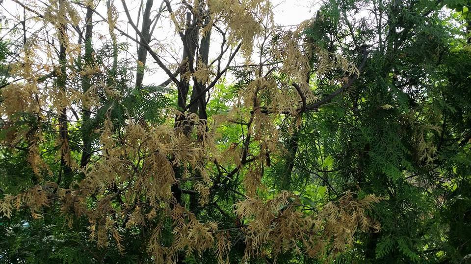 다름이 아니옵고 첨부한 사진에 보이는 게 측백나무의 잎마름병인지 알고 싶어서 여쭤보게되었습니다