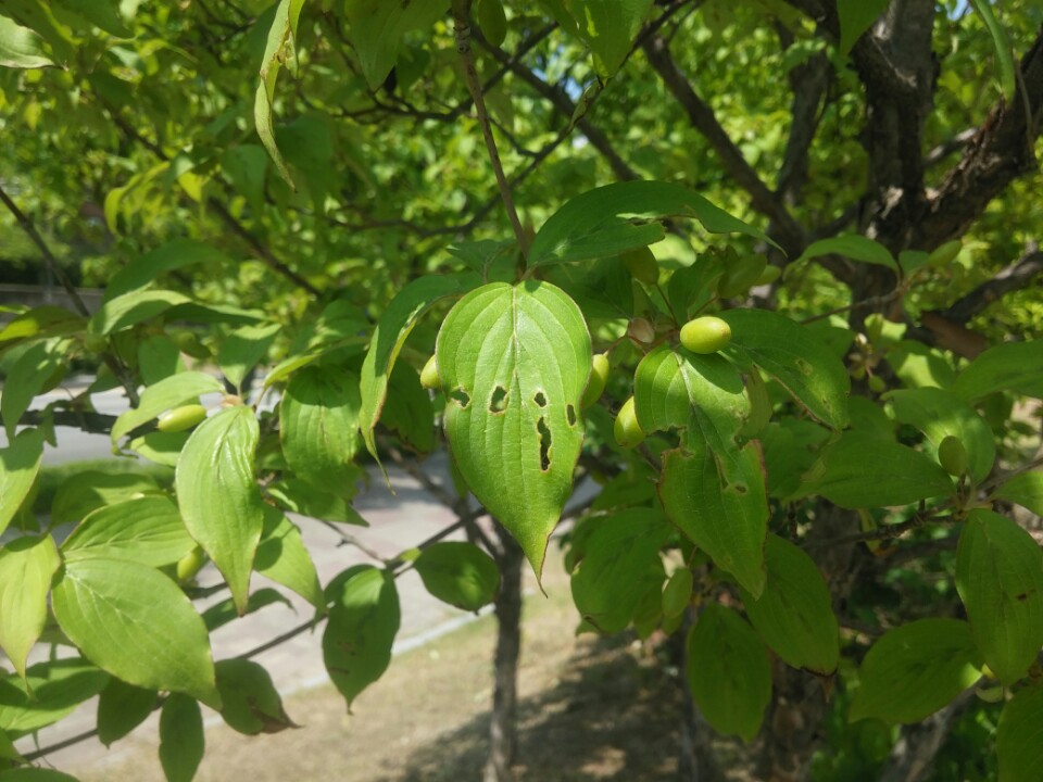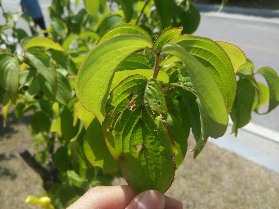 1. 산수유 잎의 구멍은 식엽성 해충의 흔적이라고 생각됩니다.