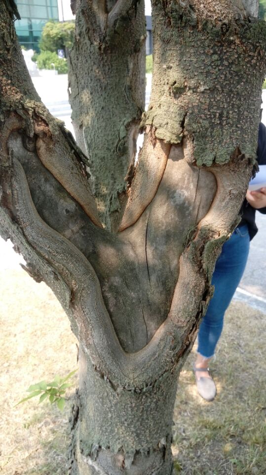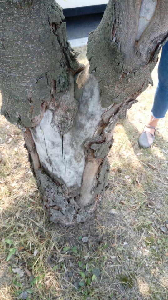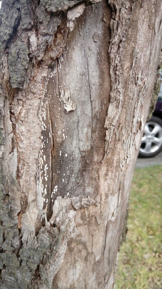 흰색을 띄거나 반점이 생기는 것은 수간부패로 인한 목재부후 증상입니다.