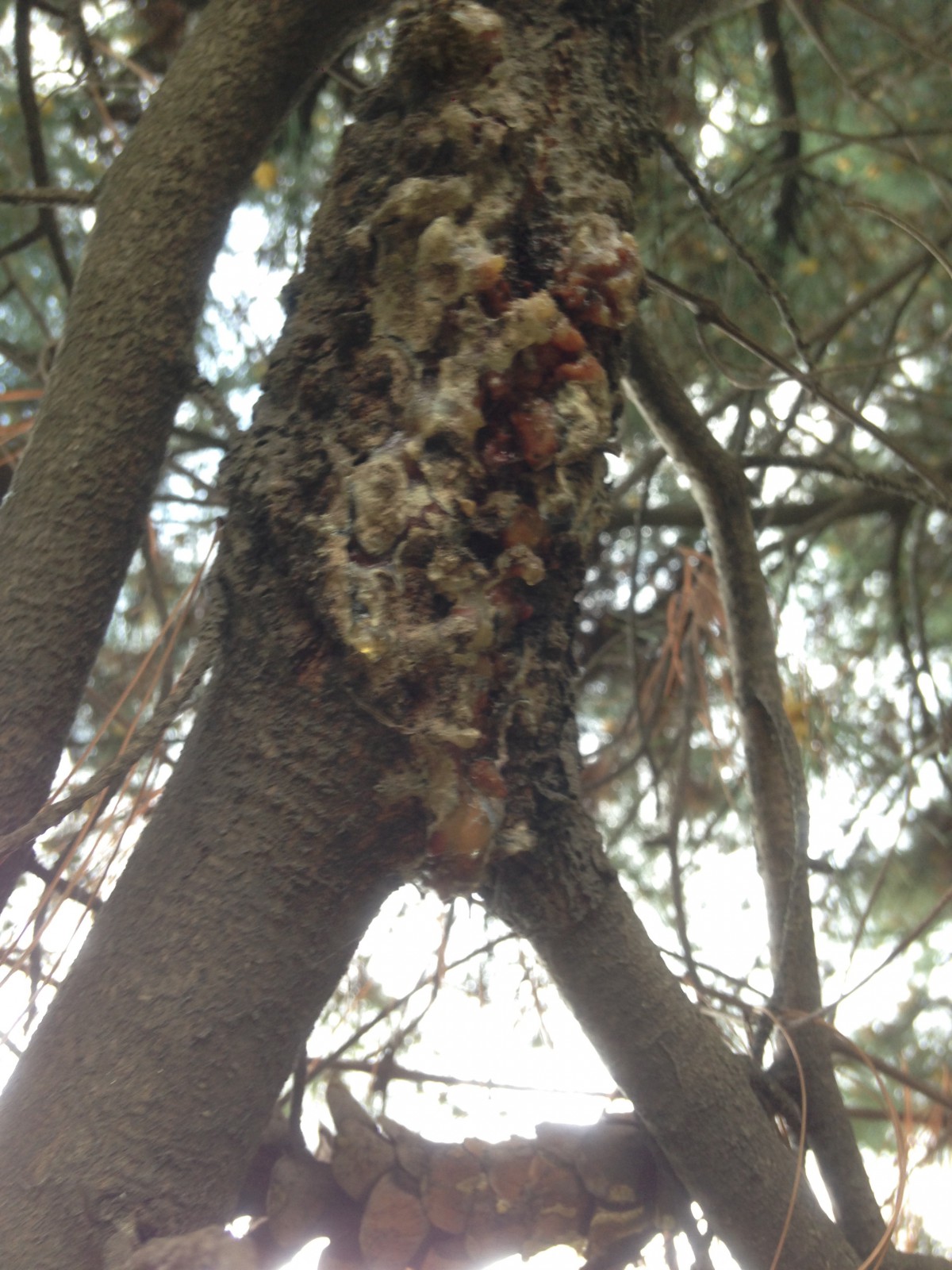사진상의 환부는 어떤 원인으로 인하여 수피에 피해를 받은 후 송진이 흘러내려와 엉켜붙어있는 상태로 보여집니다.