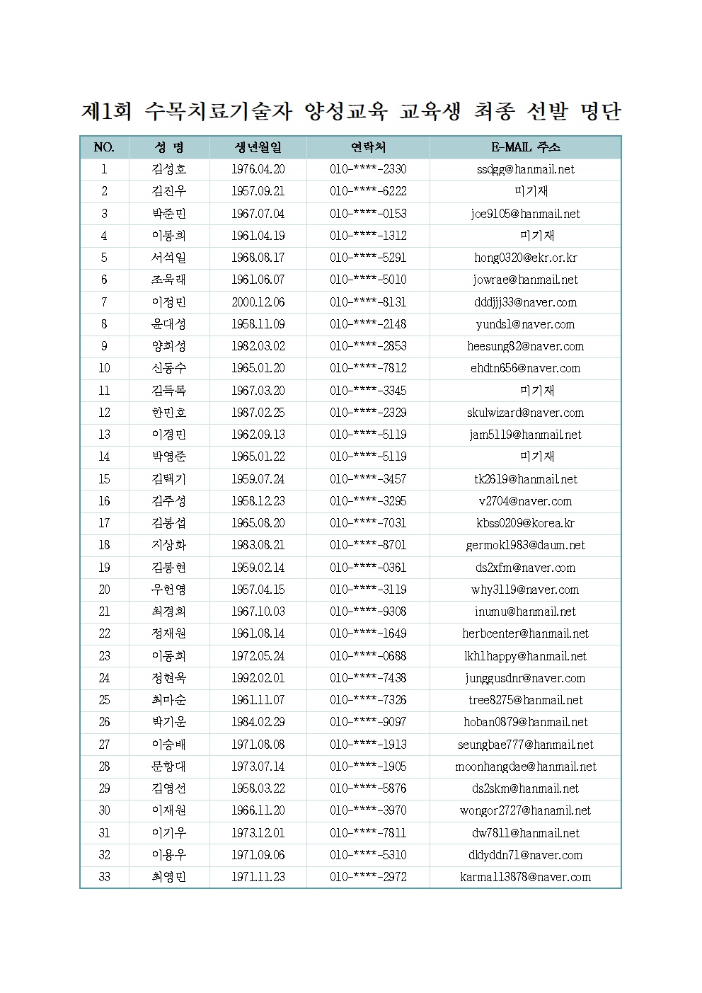 - 제1회 수목치료기술자 양성교육 교육생 최종 선발 명단.hwp (21.0K) 114회 다운로드 | DATE : 2019-02-19 09:53:06